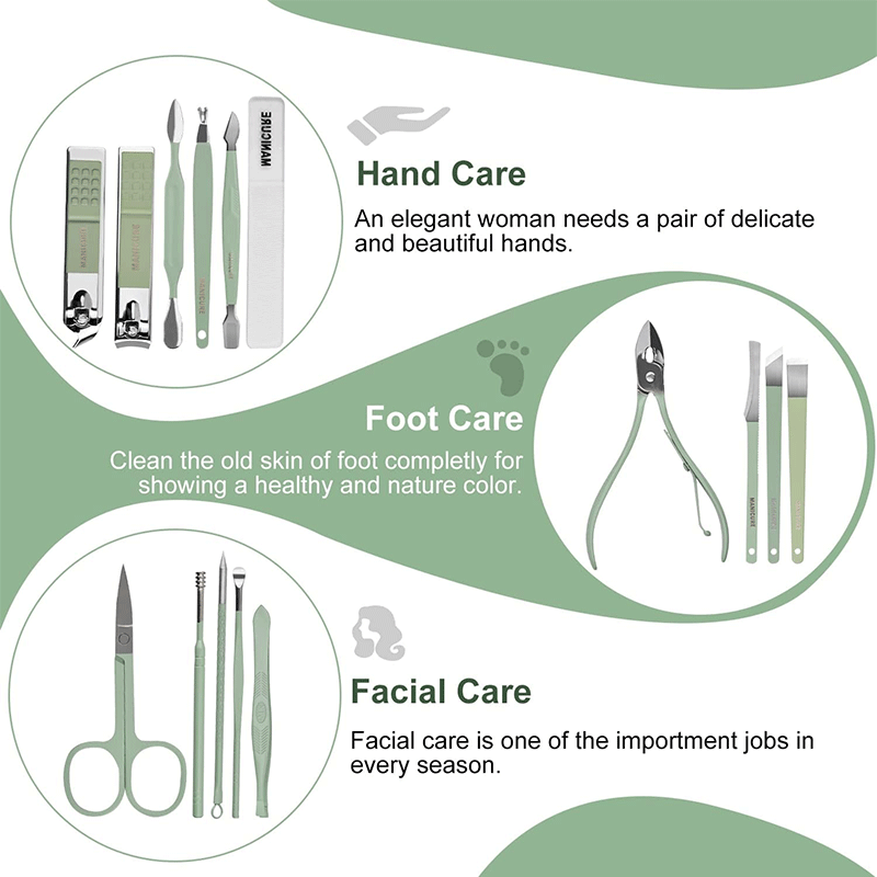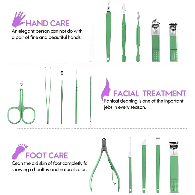 - It typically includes 16 stainless steel tools, such as nail clippers, scissors, tweezers, cuticle pushers and more, neatly organized in a stylish pouch for easy storage and travel.