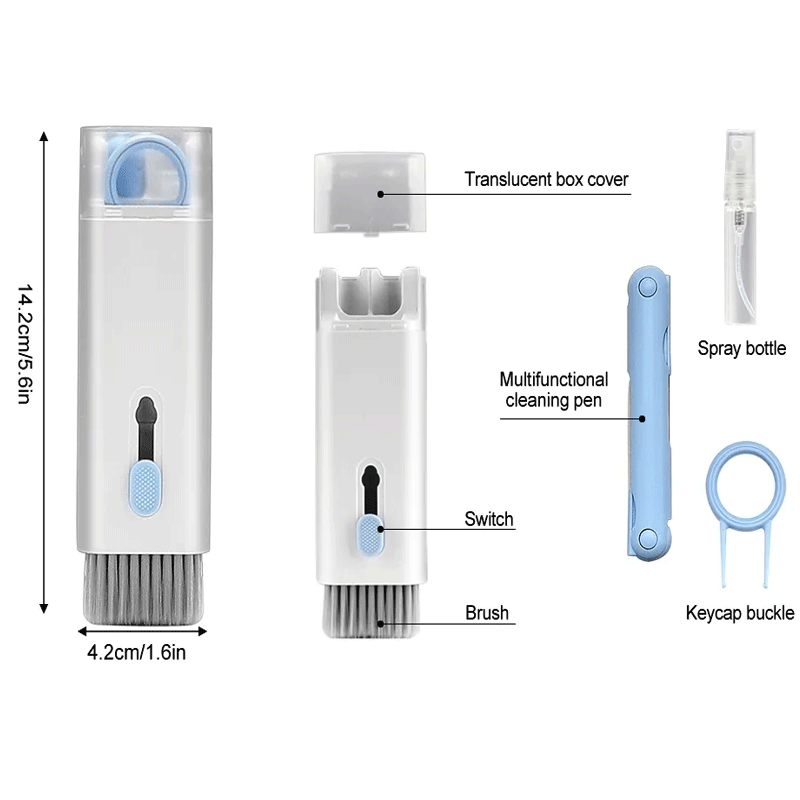- 7-in-1 Tool Kit - Soft Brush, Keycap Puller, Flocking Sponge, High-Density Brush, Metal Pen Tip, Spray Bottle and Cleaning Cloth.