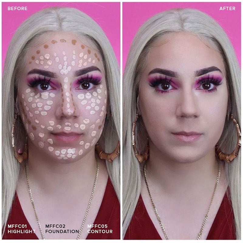 Using the doe-foot applicator, apply formula to desired areas of the face that require coverage and blend out with a brush or beauty sponge. Spot conceal areas that need more coverage and blend out with a brush, beauty sponge, or your fingers. Use a shade that is 1-2 shades darker than your natural skin tone and apply it under the cheekbones and jawline, and blend for a sculpted look. Use a shade that is 1 shade lighter than your natural skin tone and apply a light application to the under eyes and bridge of the nose to brighten up the face and add even more dimension!