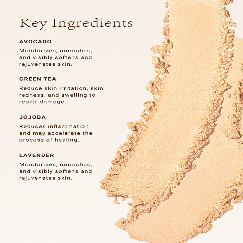 Mica, Silica, Tridecyl Trimellitate, Ethylhexyl Palmitate, Caprylic/ Capric Triglyceride, Magnesium Stearate, Phenoxyethanol, Magnesium Myristate, Polyglyceryl-2 Dipolyhydroxystearate, Octinoxate (Ethylhexyl Methoxycinnamate), Persea Gratissima Oil, Simmondsia Chinensis (Jojoba) Seed Oil, Glyceryl Caprylate, Caprylyl Glycol, Ethylhexylglycerin, Triethoxycaprylylsilane, Camellia Sinensis Leaf Extract May Contain: Fd&C Yellow 5 Aluminum Lake (CI 19140) , Red Iron Oxide (CI 77491), Yellow Iron Oxide (CI 77492), Black Iron Oxide (CI 77499), Titanium Dioxide (CI 77891).