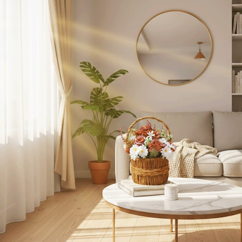 - Basket Style: The flowers are nestled in a woven, rope-textured basket with a sturdy handle for a vintage, cottage-core look.