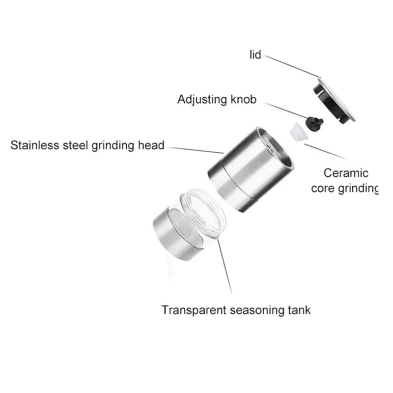 - Grinds coarse salt, peppercorns, herbs and spices.