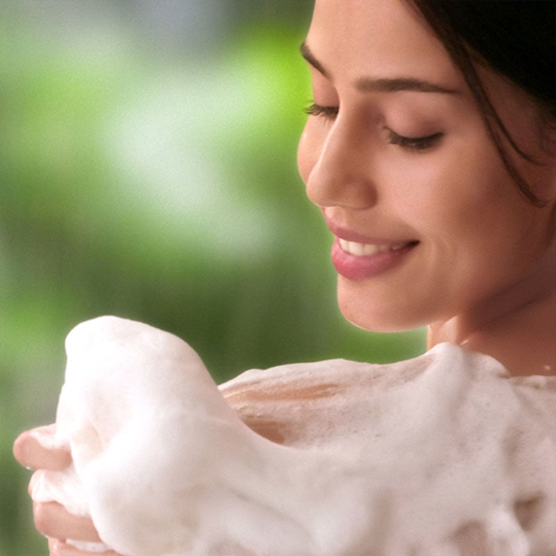 - Create rich foam by pouring a coin sized drop on a wet loofah. Squeeze to make it lather.