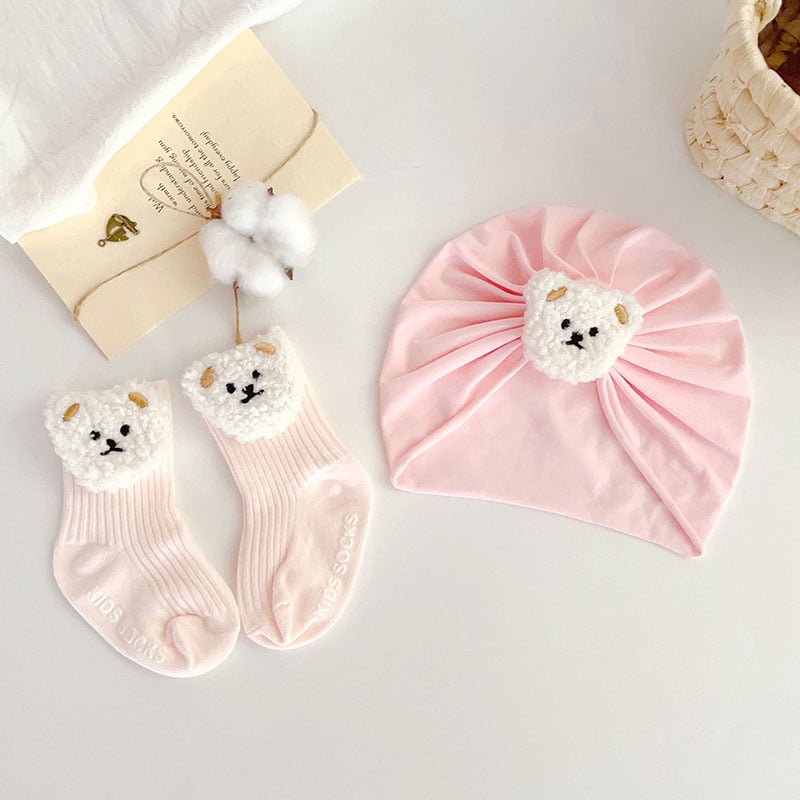 Cartoon Bear Baby Hat & Sock Set - Pink