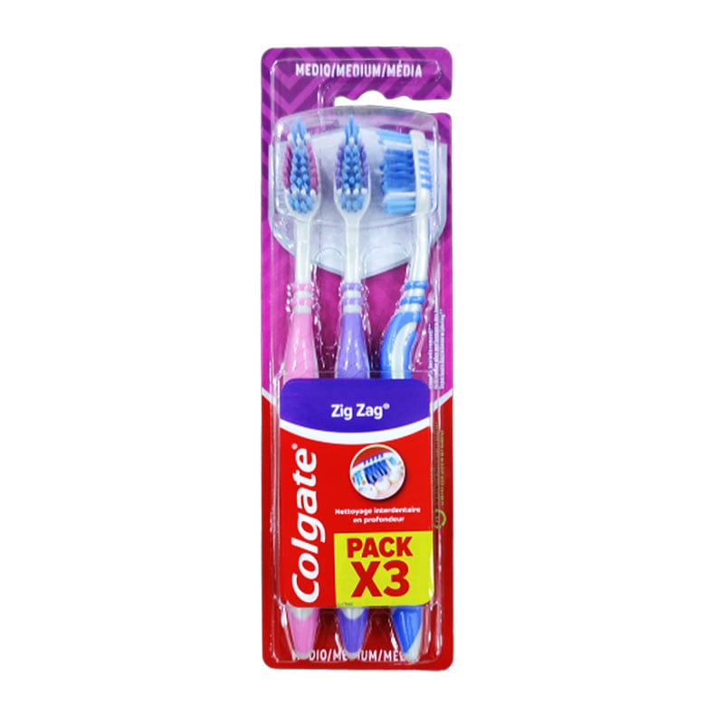 - The Colgate Zigzag Medium Toothbrush 3pcs offers advanced multi-angled bristles for thorough cleaning between teeth and along the gumline.