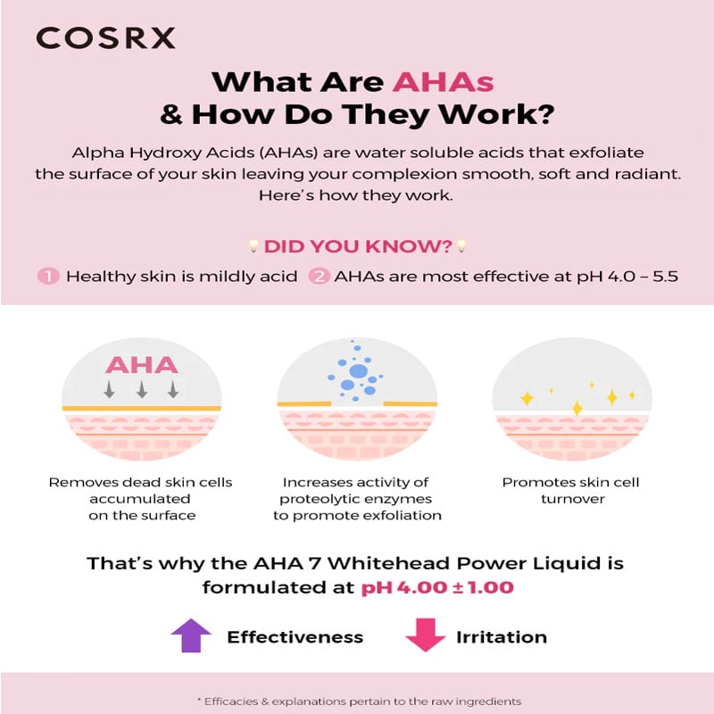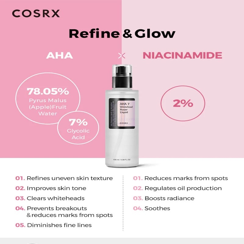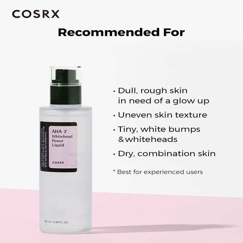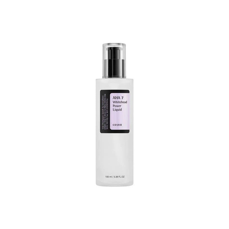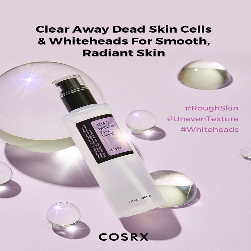 - The Cosrx AHA 7 Whitehead Power Liquid is an essence to clear away dead skin cells within the pores.