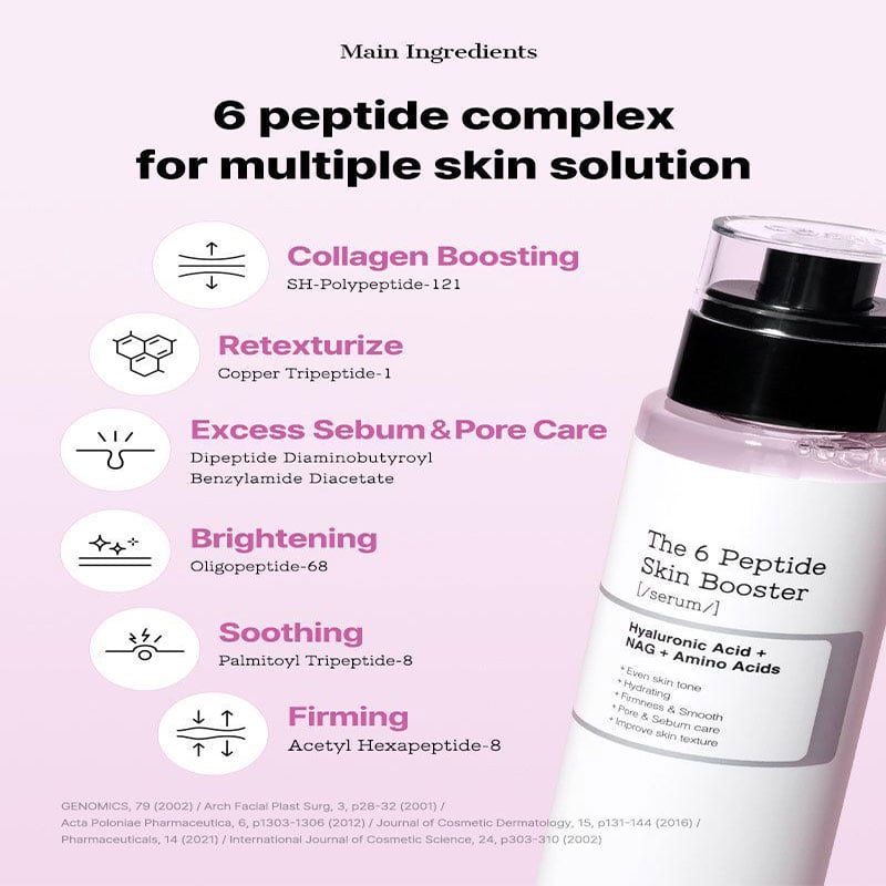 - The 6 peptide skin booster contains 6 multi peptides that boost overall skin condition such as pore & sebum, firmness, fine lines, skin texture, skin tone and soothing.