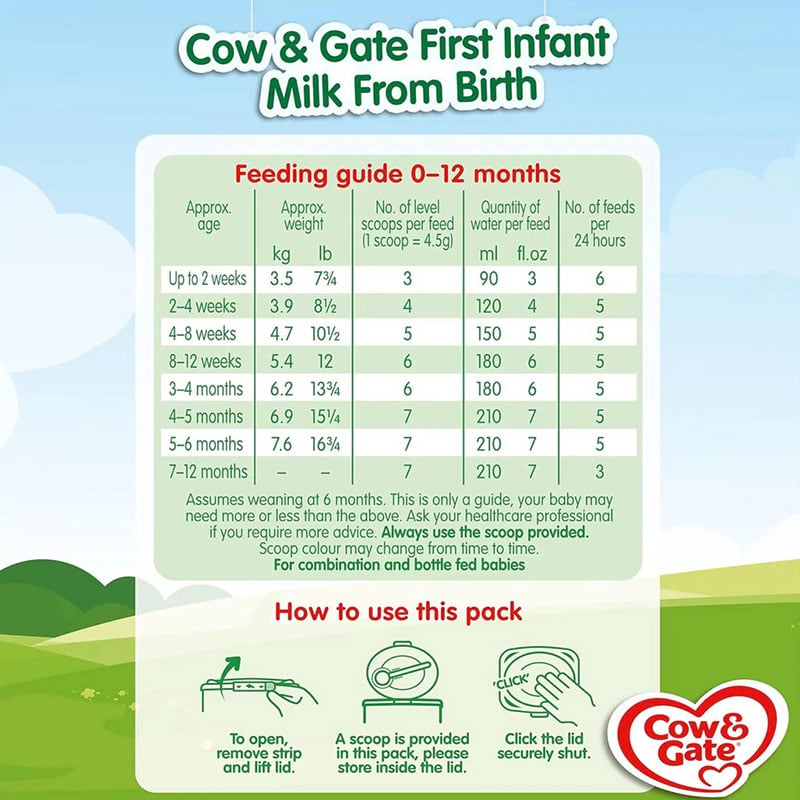 - Cow & Gate Stage 1 First Infant Baby Milk Powder Formula is a baby milk suitable from birth as a sole source of nutrition.