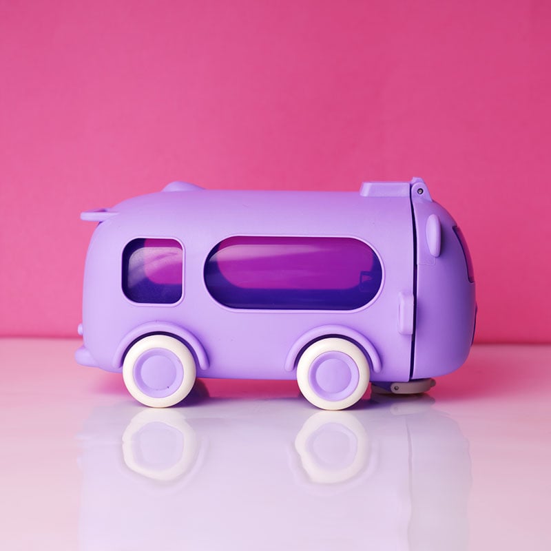 - The bottle is shaped like a cute cartoon bus and comes in Baby Blue, Cream, Purple.