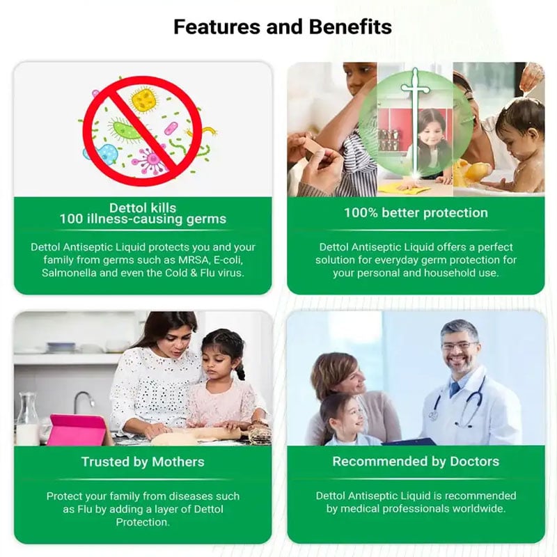 - Dettol Antiseptic combines Dettol’s Trusted germ protection with Original fragrance to effectively protect you from germs that causes infection.