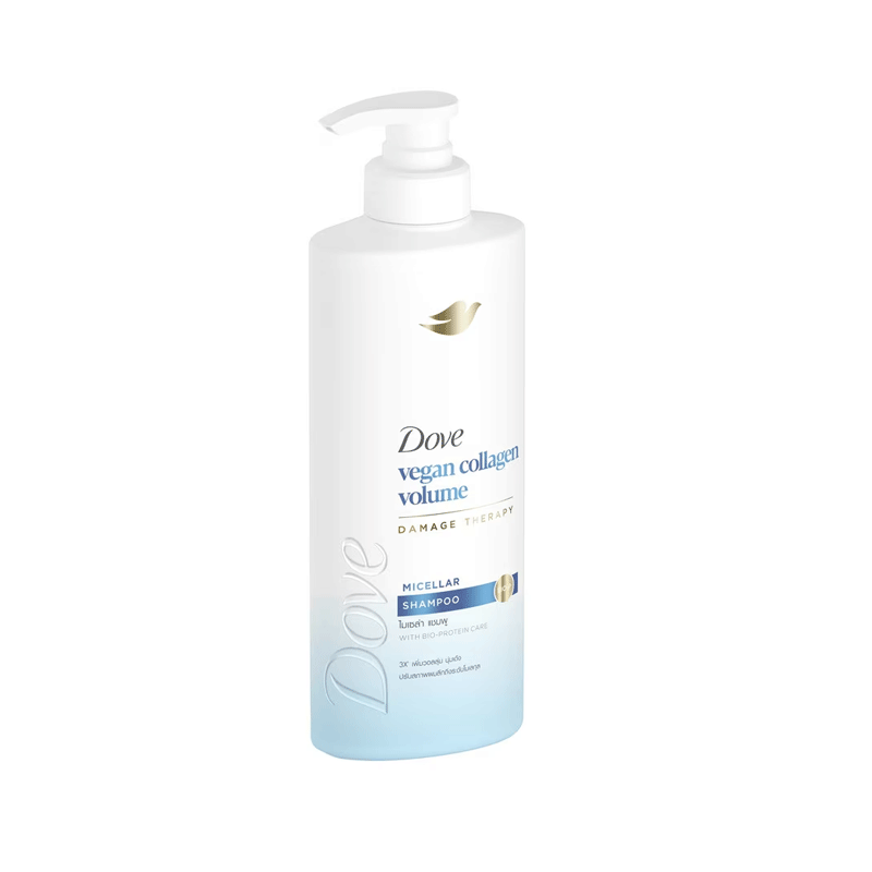 - Dove Vegan Collagen Volume Micellar Damage Therapy Shampoo Formulated with Vegan Collagen, known to help nourish hair for a naturally bouncy look.