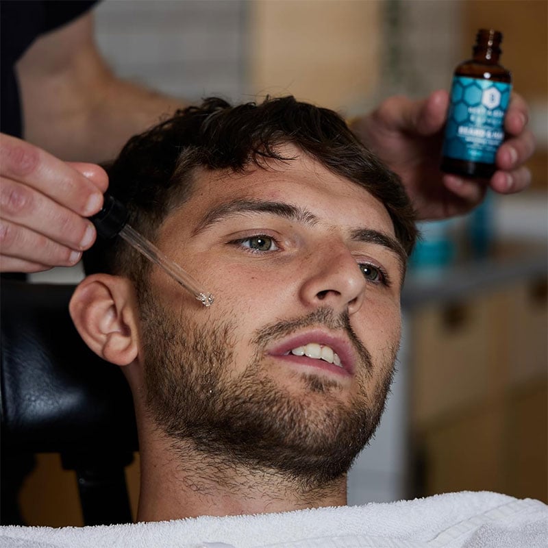 - Put 2 or 3 drops of Beard Oil into your palm.