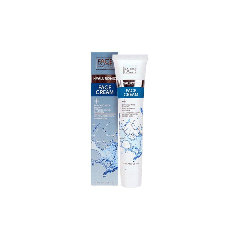 - Face Facts Hyaluronic Face Cream 50ml A lightweight, hydrating moisturizer enriched with Hyaluronic Acid and Glycerin to deeply moisturize and plump the skin.