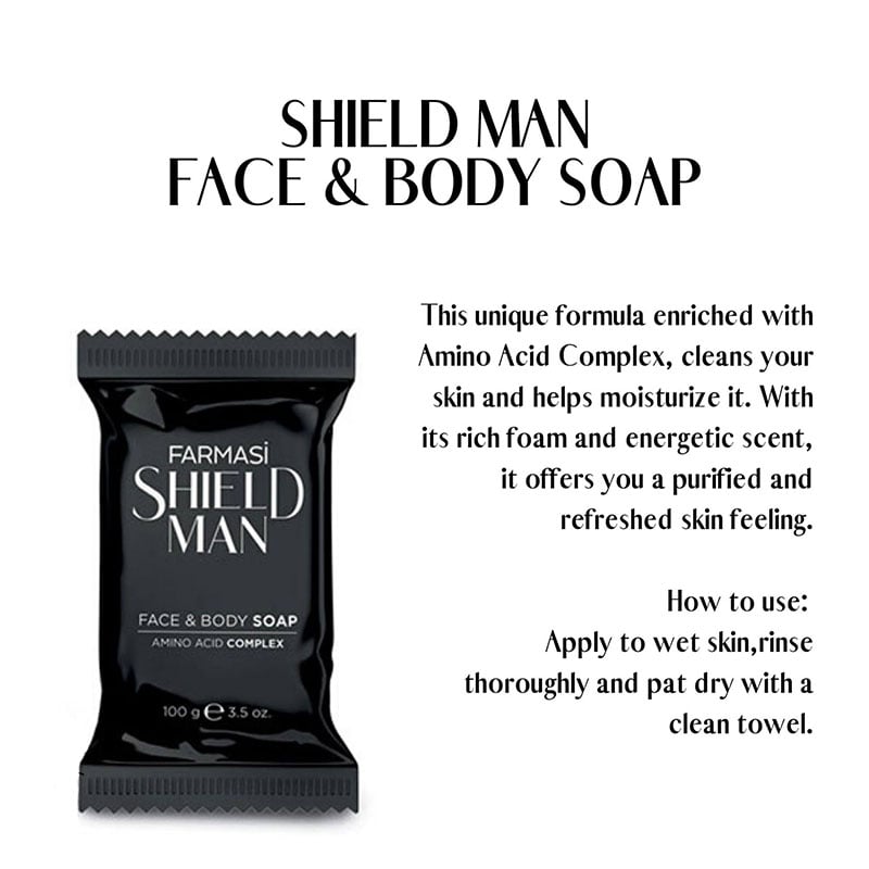 - Experience a revitalizing cleanse with Farmasi Shield Man Amino Acid Face and Body Soap.