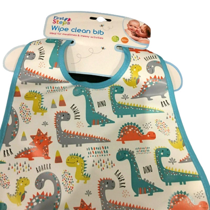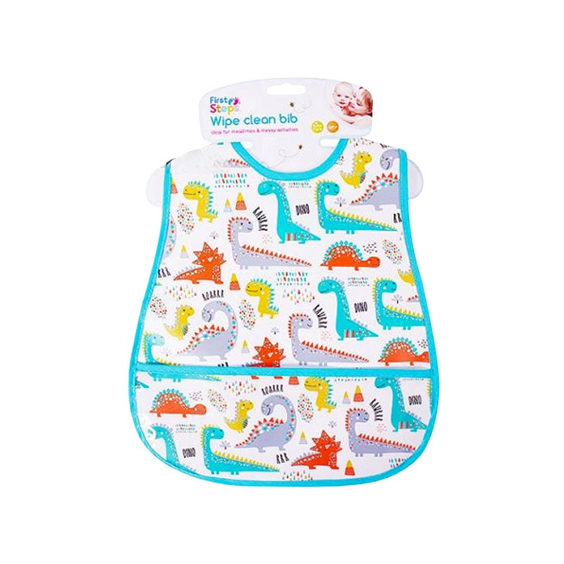 - First Steps wipe clean coverall baby bib with crumb catcher pocket.