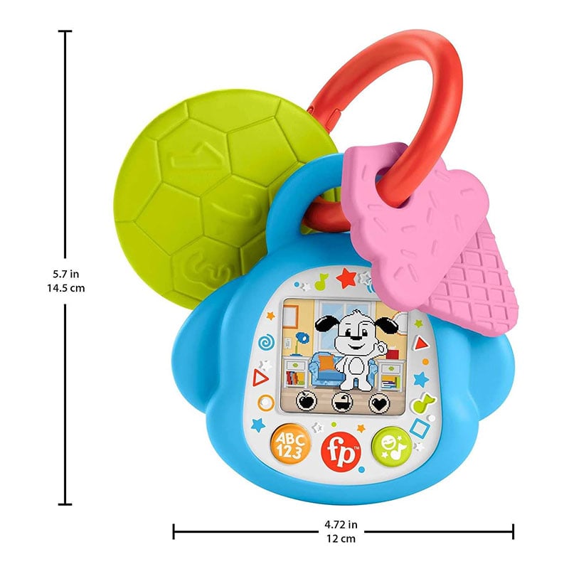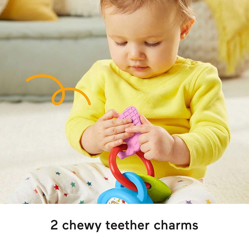 - Sized for small hands to grasp with a take-along ring and 2 cute charm teethers.