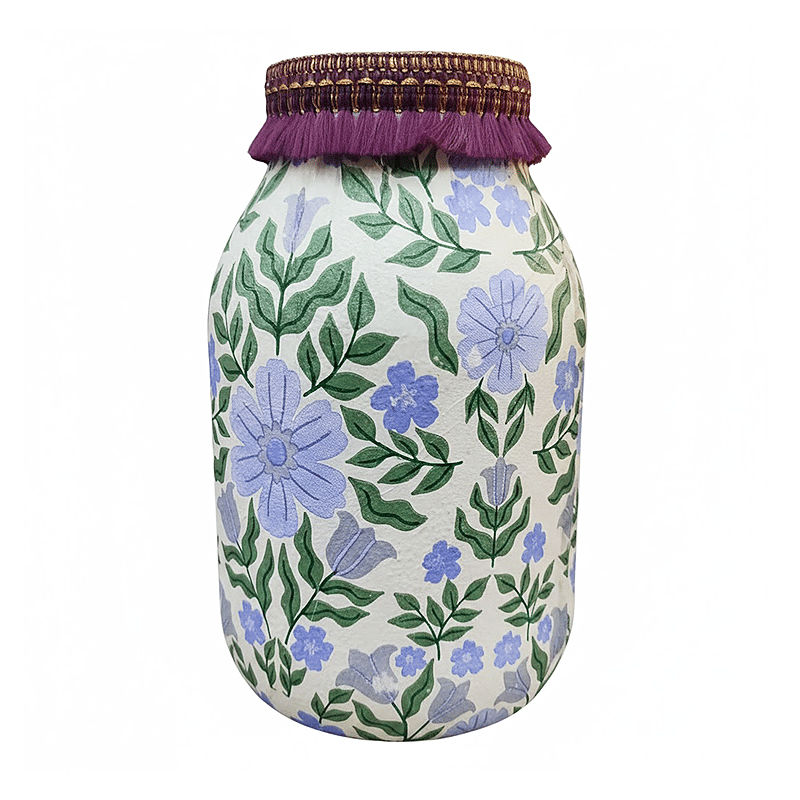 - This decorative vase showcases a serene all-over print of light blue and purple blossoms intertwined with lush green foliage.