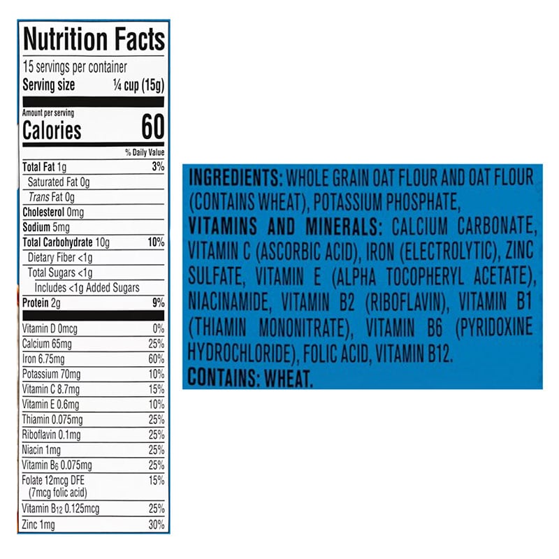 - This single grain oatmeal cereal features Vitamins C, E, Zinc & 6 B vitamins for healthy development, plus calcium for healthy bones & teeth.