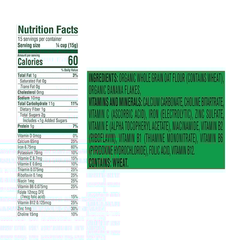 hole grain oat flour, banana flakes, potassium phosphate, b. lactis cultures. Vitamins and Minerals: calcium carbonate, vitamin C (ascorbic acid), iron (electrolytic), zinc sulfate, niacinamide, vitamin E (alpha tocopheryl acetate), vitamin B2 (riboflavin), vitamin B6 (pyridoxine hydrochloride), vitamin B1 (thiamine mononitrate), folic acid, vitamin B12.