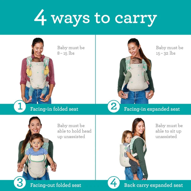- 4 ways to carry: facing-in folded seat, facing-in expanded seat, facing-out, back carry.