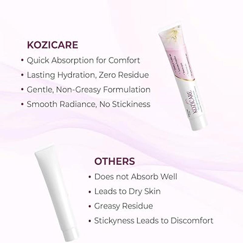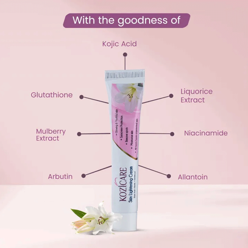- Brightens and Evens Skin Tone : Infused with Kojic Acid and Alpha Arbutin, this cream helps reduce dark spots, pigmentation, and melanin production to promote a visibly fairer complexion.