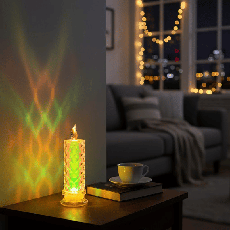 - Emits a multi-colored, iridescent green and gold glow, topped with a realistic flame-shaped bulb for a cozy, candle-like effect.