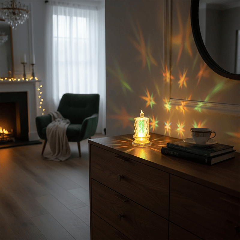- Emits a multi-colored, iridescent green and gold glow, topped with a realistic flame-shaped bulb for a cozy, candle-like effect.