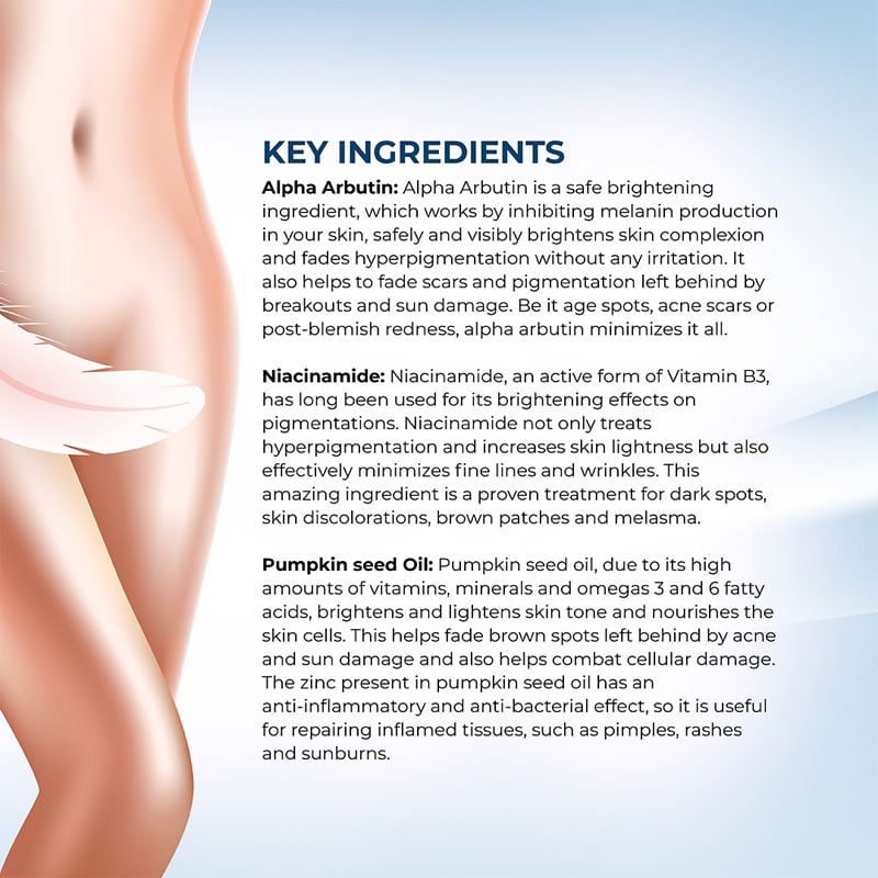 - Lightens dark underarm and intimate areas.