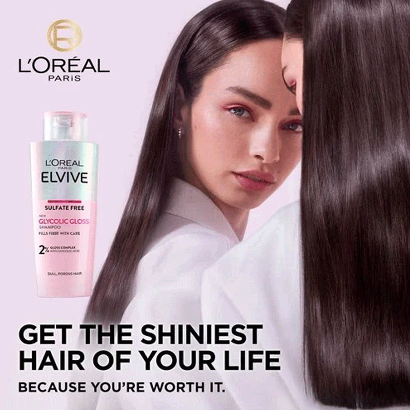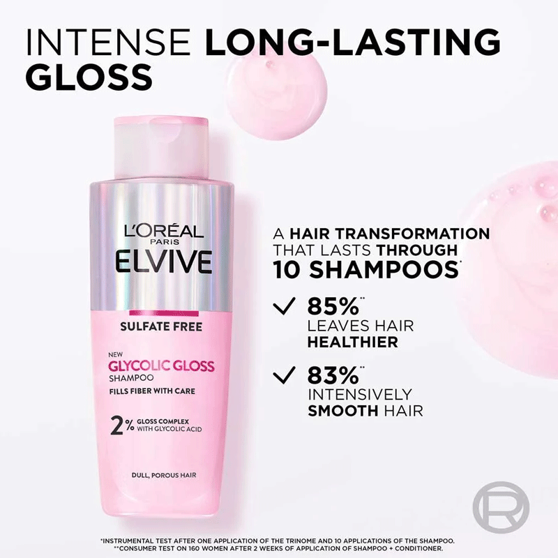- Discover L’Oréal Paris Elvive Glycolic Gloss Shampoo, the 1st step of the new at-home glossing routine powered with 2% [GLOSS COMPLEX] known for its multiple benefits in skincare. [Glycolic Acid] penetrates the hair’s fibre improving shine, smoothness & strength.