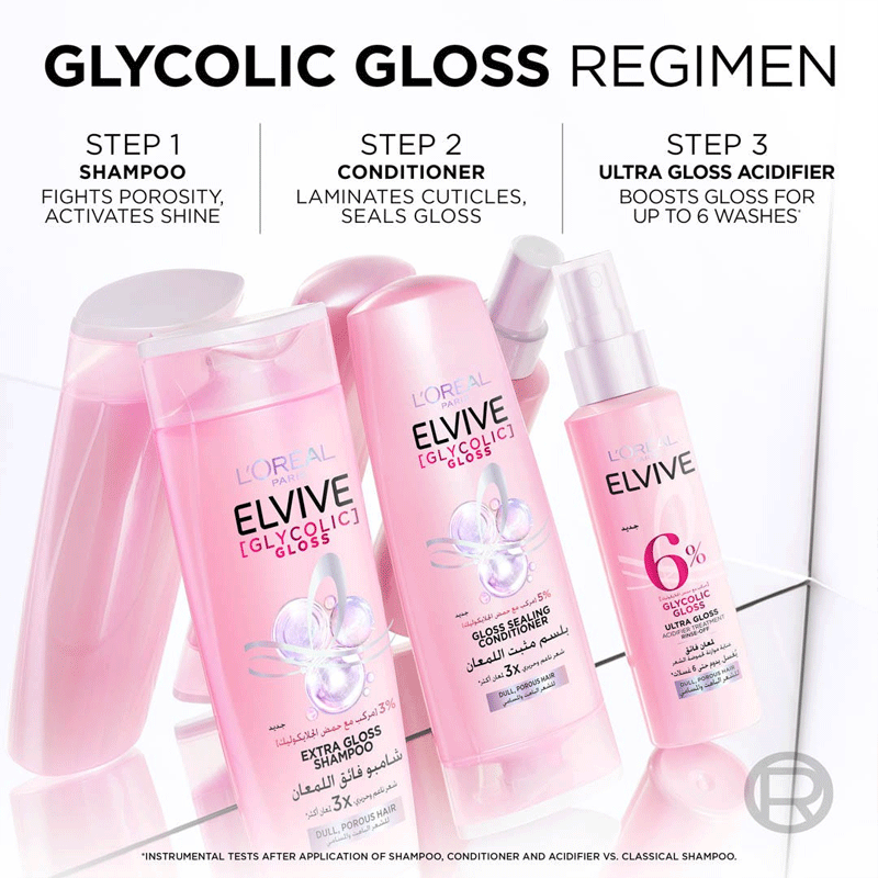 - Experience instant hair transformation and revitalize your hair with the new LOreal Paris Elvive Extra Glycolic Gloss Shampoo. Get soft and shiny hair by using our 1st at-home hair glossing shampoo enriched with glycolic acid which improves the quality of dull, damaged hair.