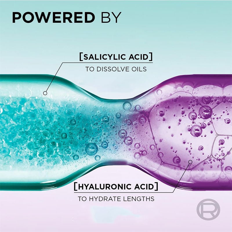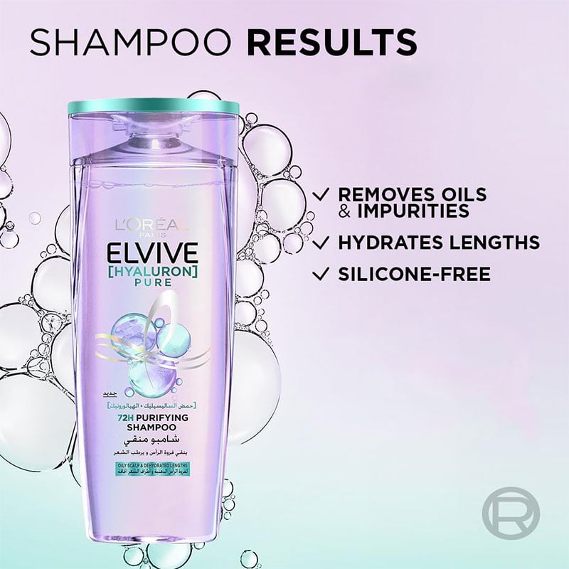 - Elvive Hyaluron + Pure 72H Purifying Shampoo is expertly designed with a salicylic acid and hyaluronic acid-infused blend to remove up to 100% of residue so you can address oily roots while prioritizing hair hydration.