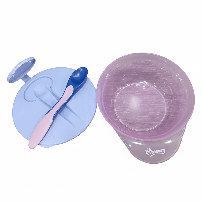 - This kit includes a translucent purple suction bowl and a matching light blue lid designed for convenient mealtime storage.