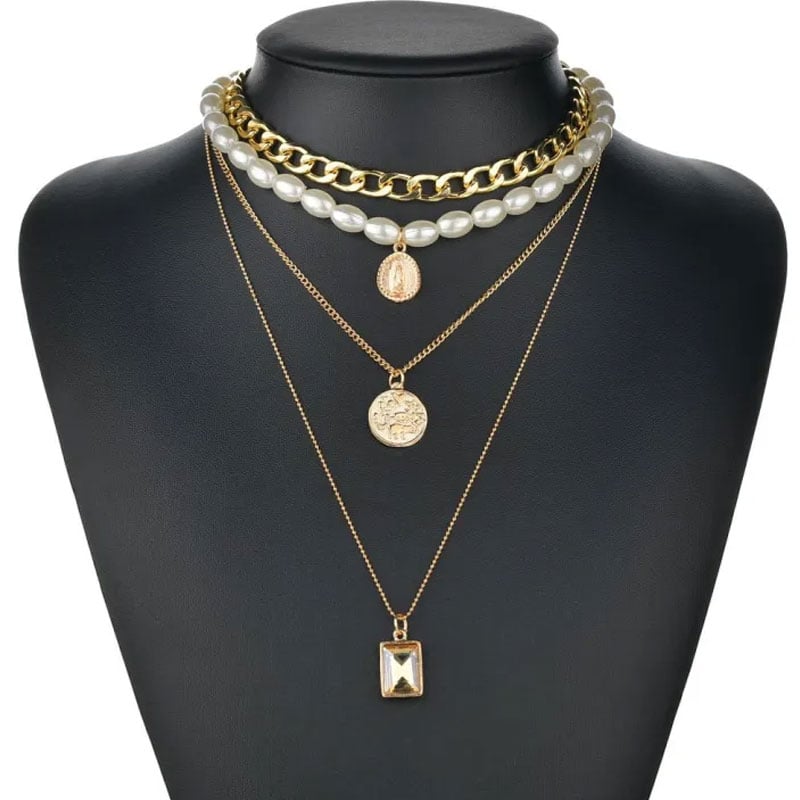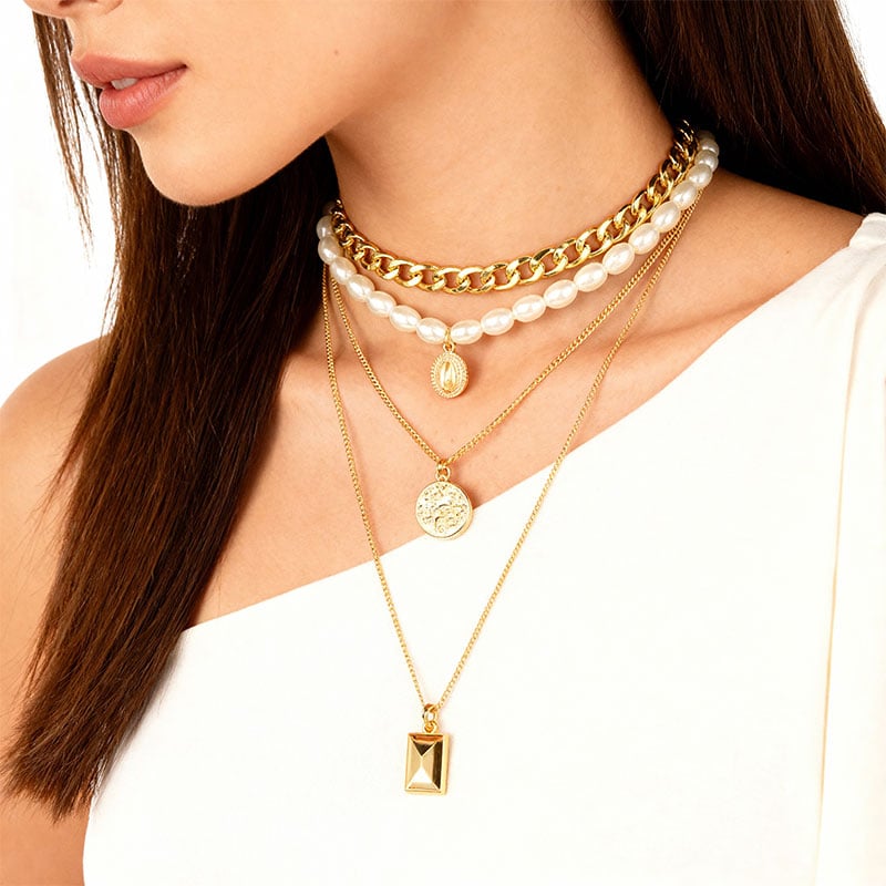 - It includes four distinct layers — a chunky gold chain choker, a strand of glossy white pearls, and two fine gold chains adorned with intricate pendants.