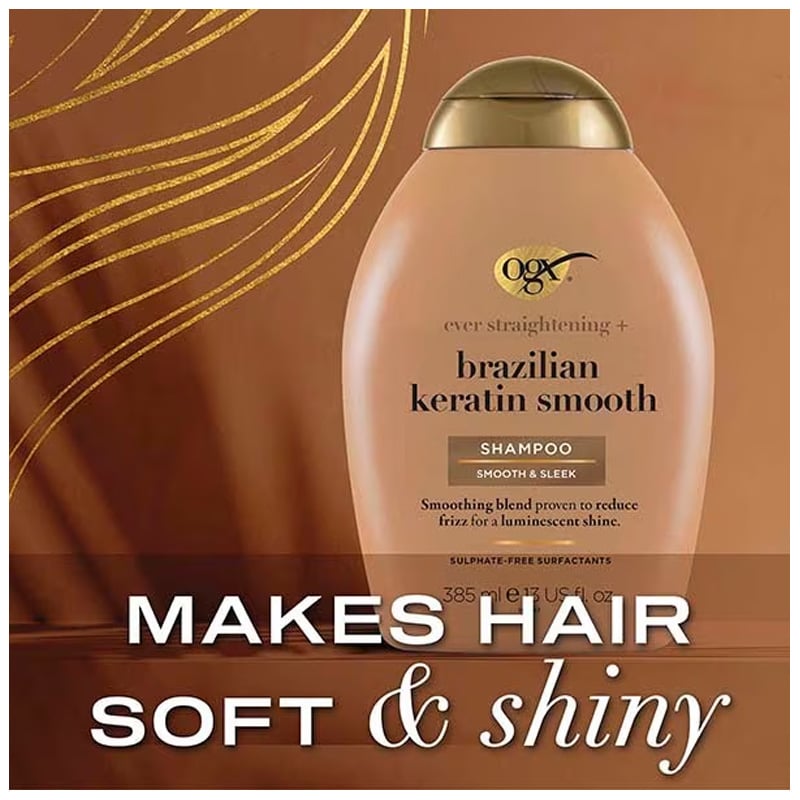 - OGX Ever Straightening+ Brazilian Keratin Smooth helps to smooth and strengthen your hair thanks to its blend of coconut oil, keratin proteins, avocado oil and cocoa butter.