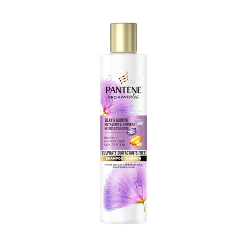 - Pantene Pro-V Silky & Shiny Shampoo without sulfates with Biotin and hydrolyzed silk protein for damaged hair.