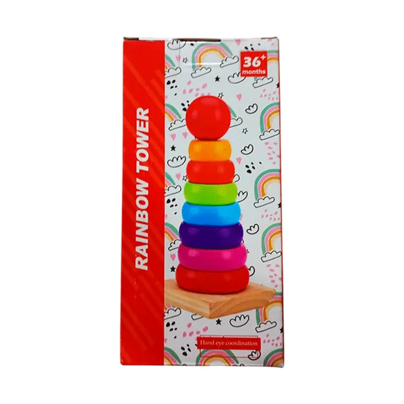 - Rainbow Tower Wooden Toy 8 Pieces 8 Piece Pyramid. Rainbow colors to stimulate the look.
