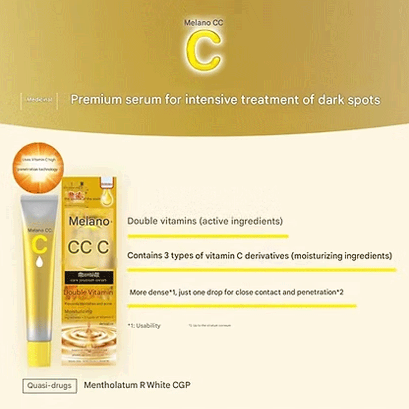 - Rohto Melano CC Vitamin C Premium Essence With 4 types of Vitamin C including 100% Pure Vitamin C (L-Ascorbic Acid is the most effective vitamin C) to penetrates deeply into skin to fight stubborn pimple marks, stubborn dark spots, acne scars, uneven skin tone and minimize pores.