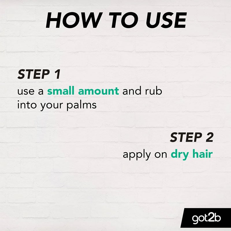 Use a small amount and rub into the palm of your hands. Apply on dry hair to achieve your look. Add more product if needed.