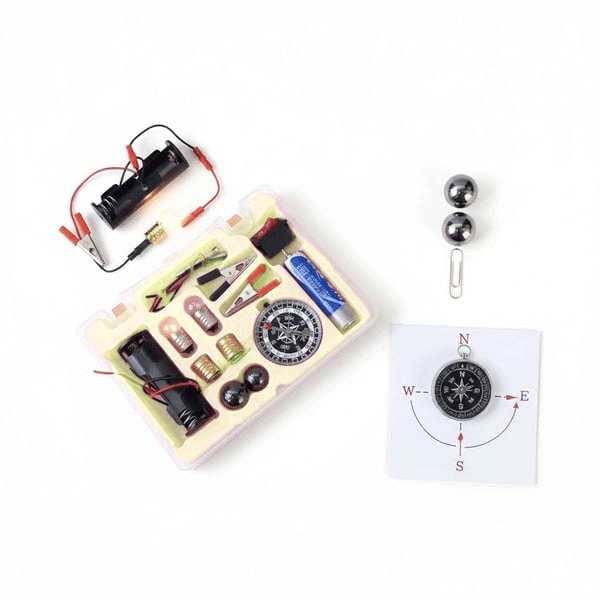 - It includes components like a compass, light bulbs, wires with alligator clips, a switch, and a battery holder.