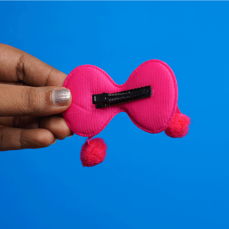 - Featuring a charming bow design accented with sparkling stones and a soft pompom center, this hair clip blends fun and fashion effortlessly.