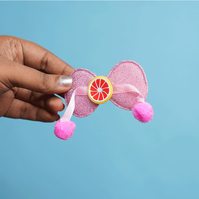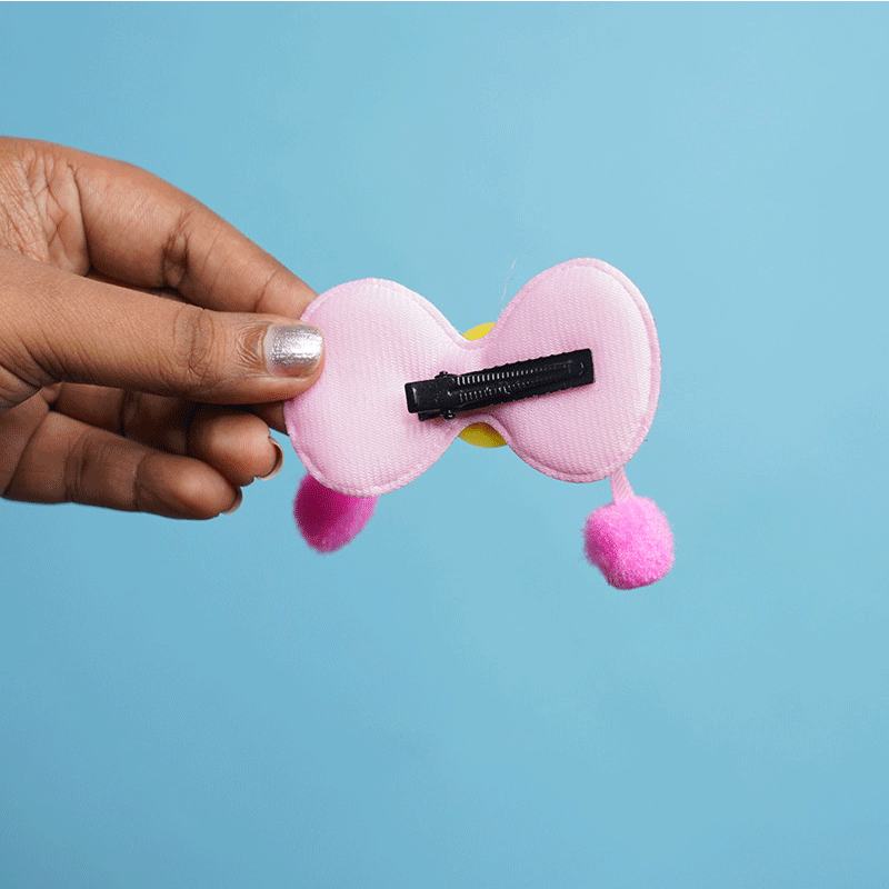 - Featuring a charming bow design accented with sparkling stones and a soft pompom center, this hair clip blends fun and fashion effortlessly.