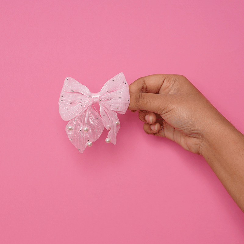 Short Bow Hair Clip With Pearls & Stone - Pink