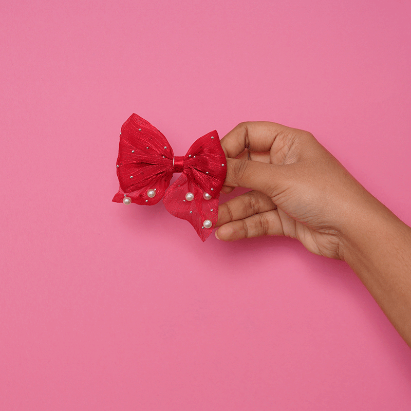 - A Short Bow Hair Clip with Pearls & Stone is a sophisticated hair accessory featuring a delicate bow design adorned with pearls and sparkling stones.