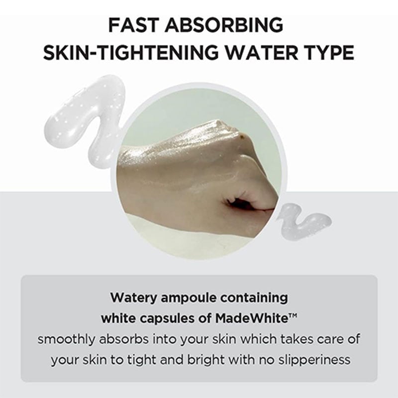 - Essence-like textured ampoule with Madewhite micro-beads quickly absorbs with a soft and non-sticky finish.
