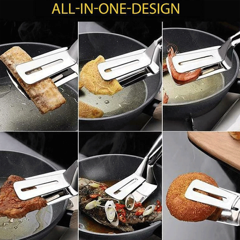 - Grab, flip & cleans: Stainless Steel Tongs Clamp, flipper and scraper, no more switch between several cooking utensils. Grab-and-hold in just one step to ensure cooking at the proper time. Can also be used to scrap/clean the griddle, spread oil, lightly dice or manage the food, or pull food out of the air fryer or ovens.