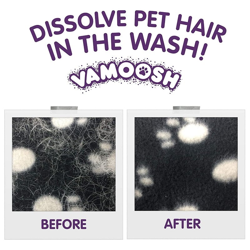- NB: Under most conditions, Vamoosh will dissolve the majority of pet hair in the washing machine, but results depend on factors such as quantity of hair, type of hair, washing machine model and amount of fabric.