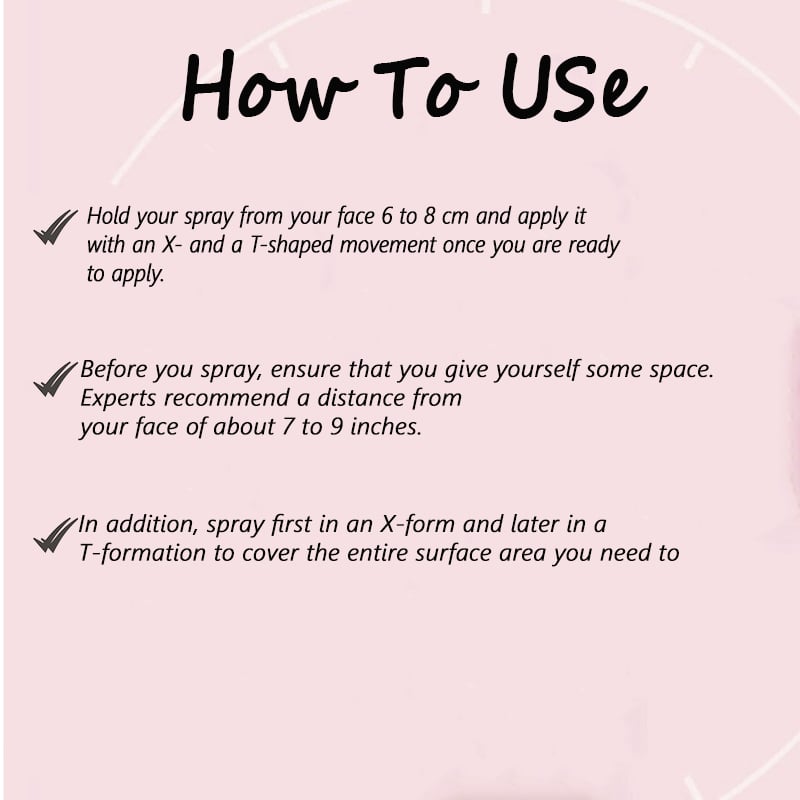 - Step - 2: Hold the bottle about six to eight inches away from your face, spray in an X or T-Formation.