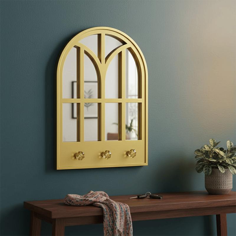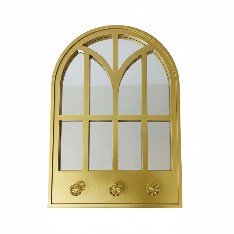 - Features a classic arched window-pane silhouette with a polished gold-toned frame that adds a sophisticated touch to any room.