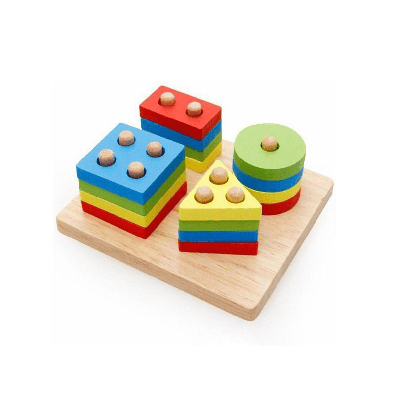 - A developmental toy featuring four distinct geometric columns to help children master shape and color recognition.