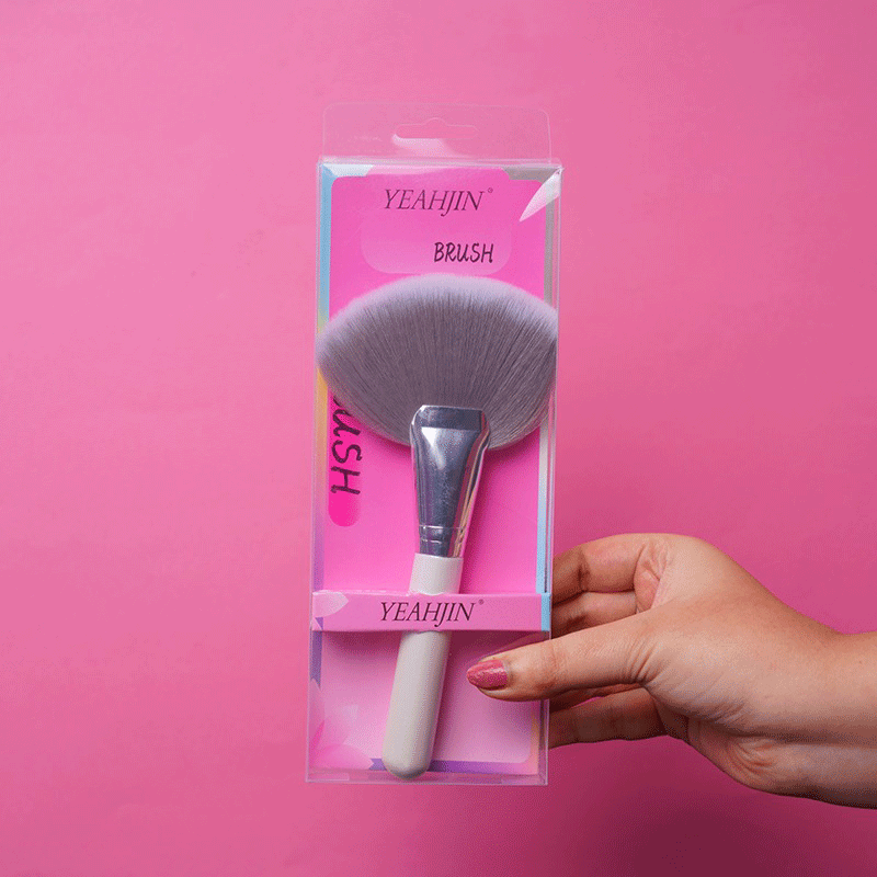 - A fan-shaped brush for applying makeup, such as blush, bronzer, or highlighter.